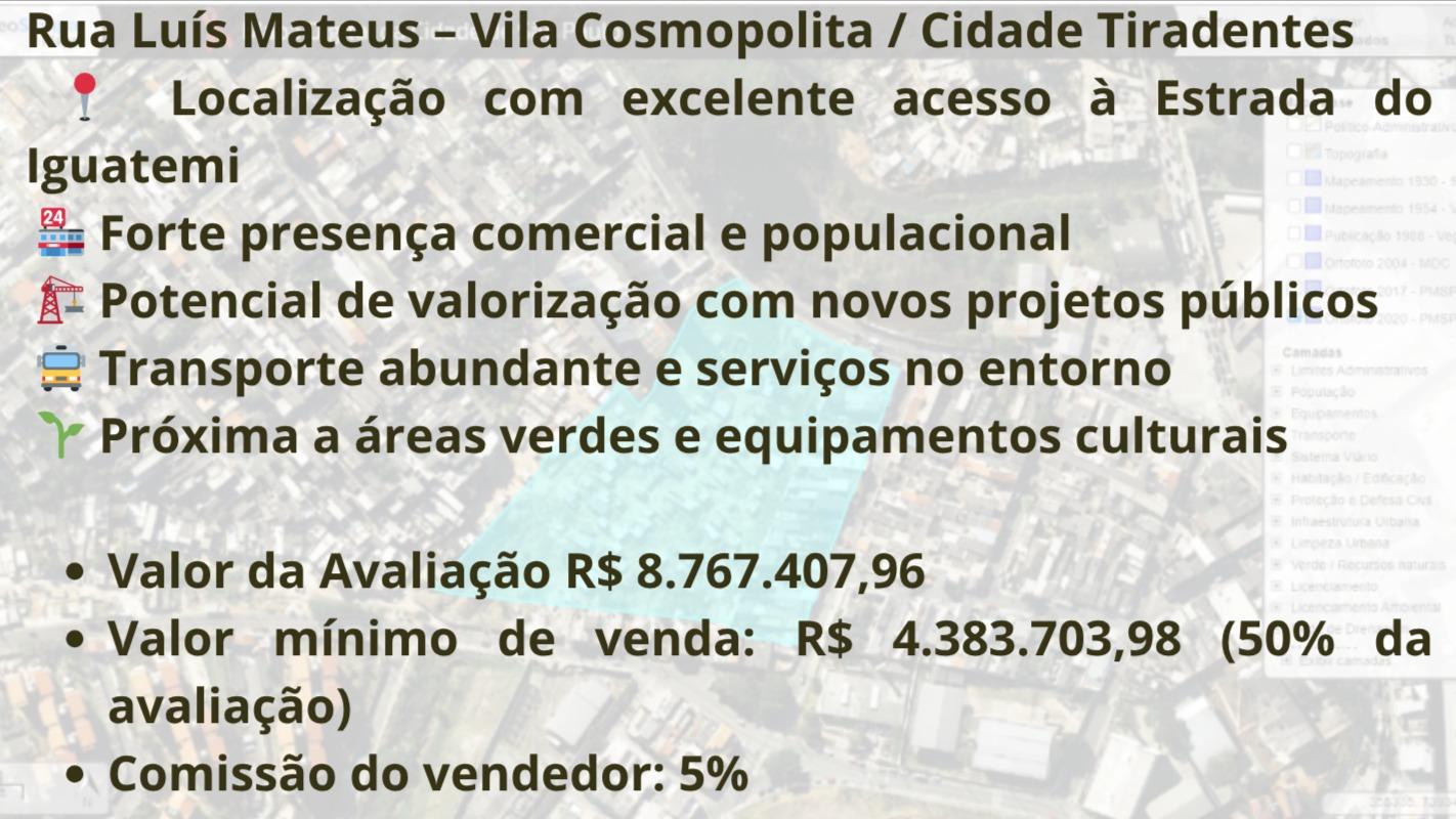 Trata-se de um terreno urbano com área total de 14.325,83m² à Rua Luís Mateus, sem número, Vila Cosmopolita, terreno vizinho ao Condomínio Residencial Morada dos Pássaros, Zona Norte de São Paulo.
